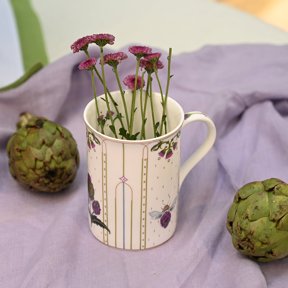 The artichoke motif symbolises resilience and prosperity, while the playful bees represent harmony and abundance.