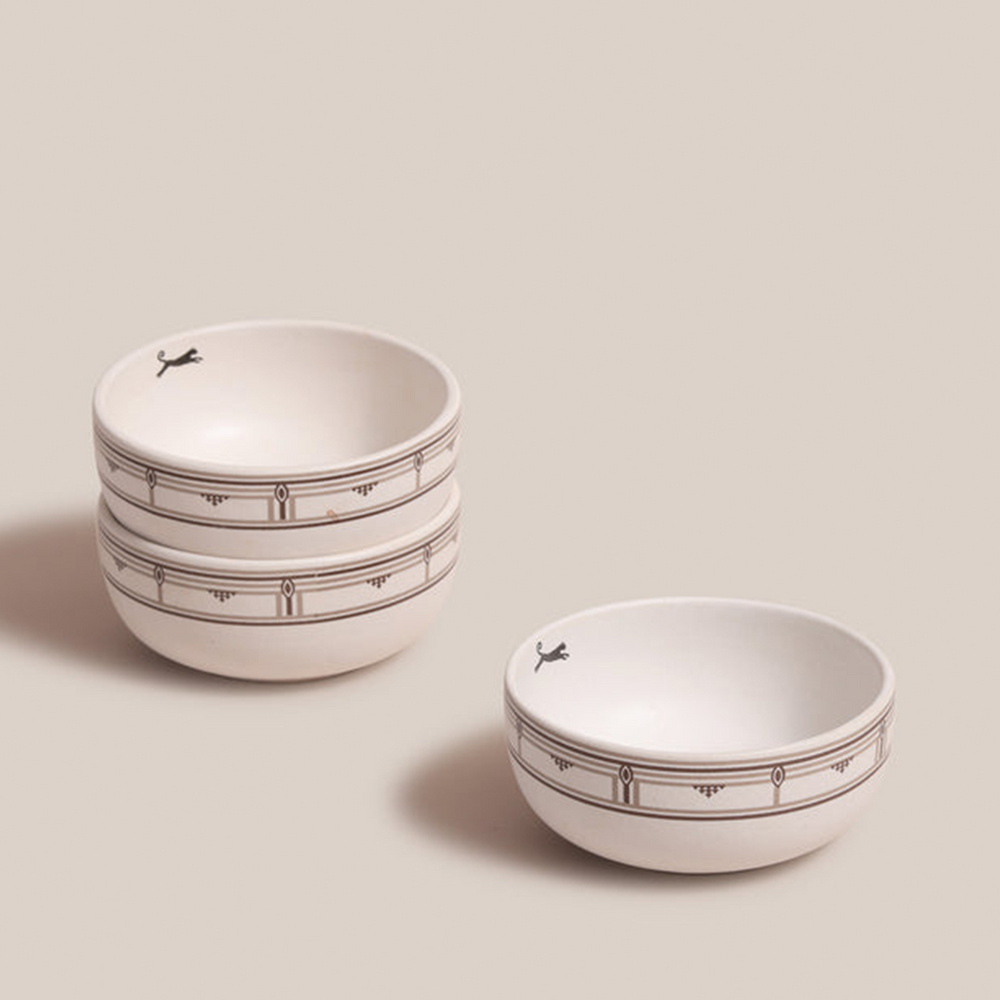 Africana 2.0 brings you a collection of stoneware that is handmade by Indian artisans. Densely packed clay baked at high-firing temperatures results in a kind of earthenware that is durable and resistant to wear for a long time. These katoris merge the longevity of stoneware with a striking geometric pattern on the outside while leaping leopards dot the inside.Set Of 4