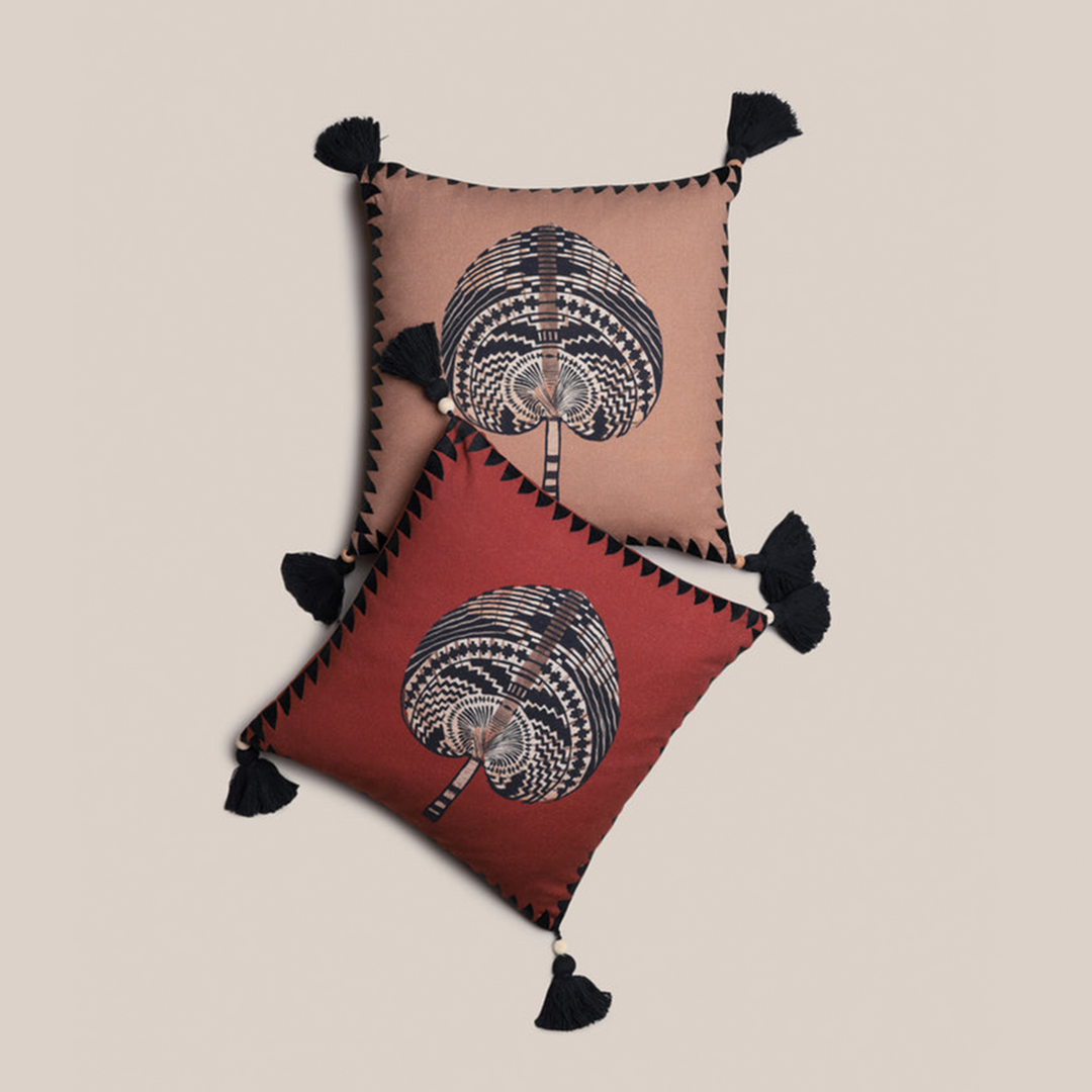 Adorn your abode with our Fan cushions and effortlessly bring in the mysterious allure of Africa in your living spaces. Crafted from cotton flax material, their pigmented hues are complemented with a native fan design on the front. The patterned trims and playful tassels add a finishing touch to the cotton-lined cushions.