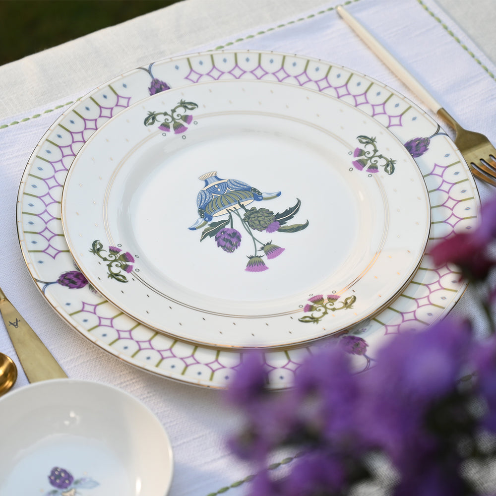 In a garden “Abloom” with vibrant flowers, the artichokes stand out with their striking silhouettes, attracting bustling bees eager to collect nectar. Each piece captures the intricate details and vivid colours of this lively ecosystem, bringing the beauty of nature to your table.